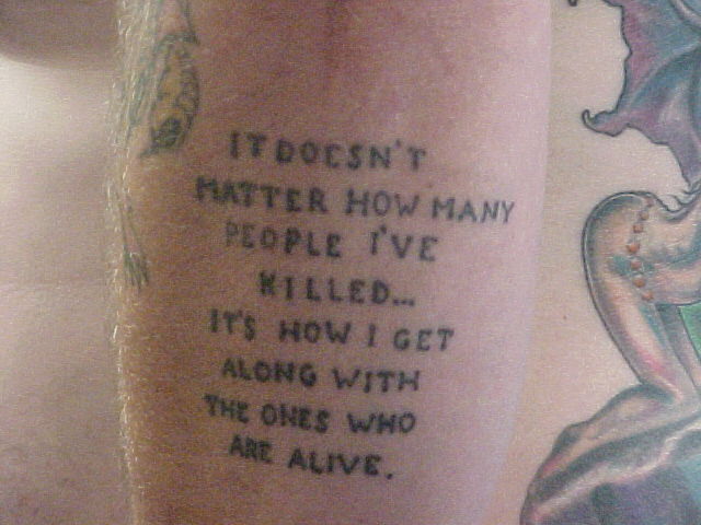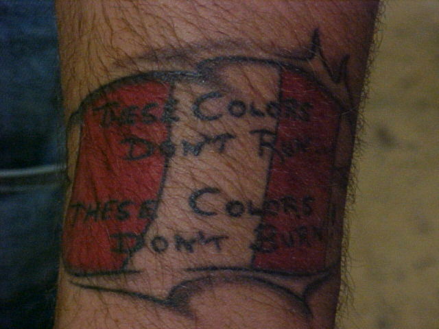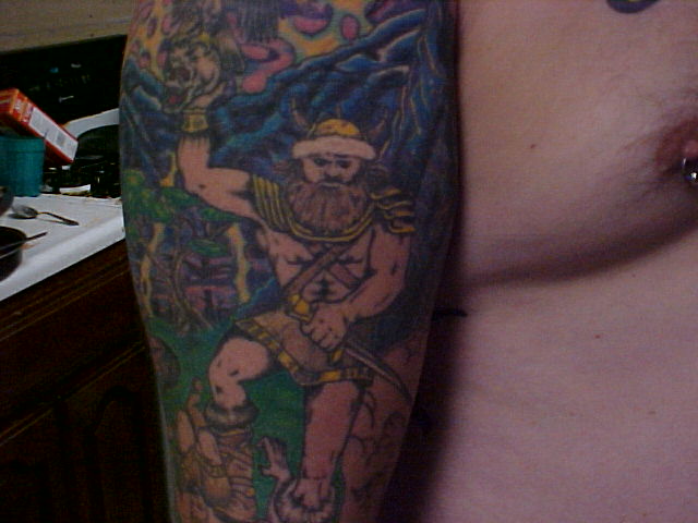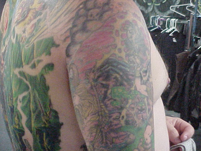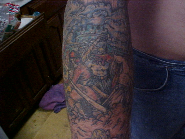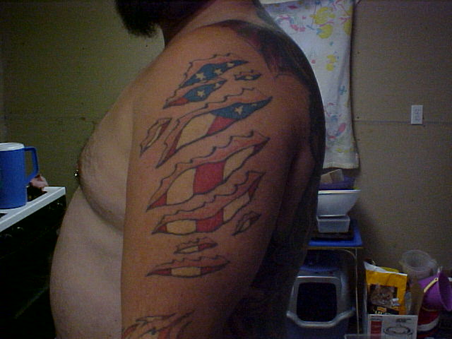 My left arm I have about 16 hours in it so far and have so much more to do to it before it is done.It will be color through the rips for the flag and other stuff. Also, it will have black and greys on the outside of the rips to make a battle scene. Which will make it look like it has a tattoo inside of a tattoo.