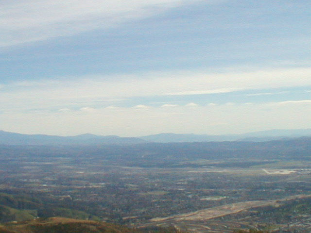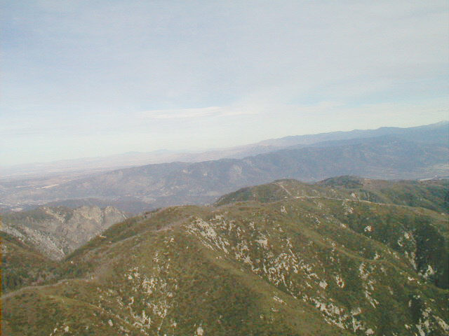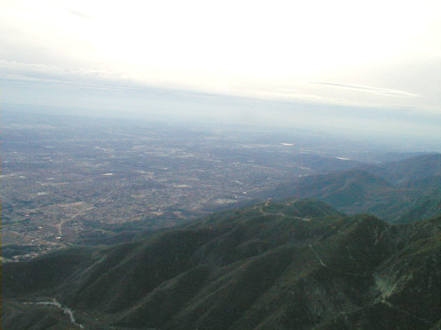 The crystal clear air made for some amazing views back to Crestline and the desert. But now my attention was focussed west, and the outline of downtown L.A. beckoned me on. The next climb was off a spur right in front of Cucamonga- getting stronger at last at 1300 {6.5m/s} up on the averager and peaking off the vario. Downwind glides were good, jumping spines,