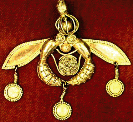 This is a Cretan Bee Pendant, image of the "Double Goddess" (Demeter & Persephone), from Chryssolakkos, the Necropolis at Malia c. 1700 B.C. (Museum of Herakleion, Crete), Here you see Demeter & Persephone are bothe equated with the Bee.