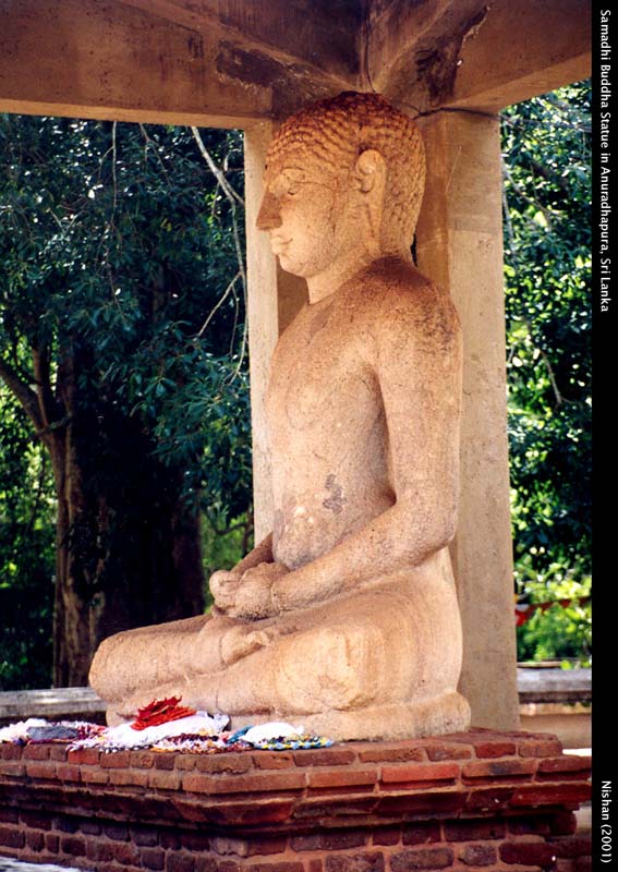 Samadhi StatueSamadhi Statue is considered one of the best sculptures in the Anuradhapura era. It is thought to be done during the 3rd or the 4th centaury. It is made out of dolomite marble and stands 7 feet 3 inches (2.21 metres) in height. This statue was found in the present location in 1886 fallen to the ground with damages to the nose. It was then erected and the nose was reconstructed. In 1914, it was found damaged by treasure hunters and re constructed again. The statues eyes are hollow indicating they were impressed with crystal or precious stones. It is unclear whether this and the 2nd statue were brought from another vihara or they were originally kept here. It is said that when you look at the face of the statue from three sides they show 3 different features. Looking at the profile of the face from left and right they show a slight sadness and a slightly smiling face on the other. Looking from the front, the face shows neutral features. Today this stature is covered by concrete structure which has somewhat destroyed the beauty of this statue. Even the reconstruction of the nose has not been a success which looks very artificial. Articles