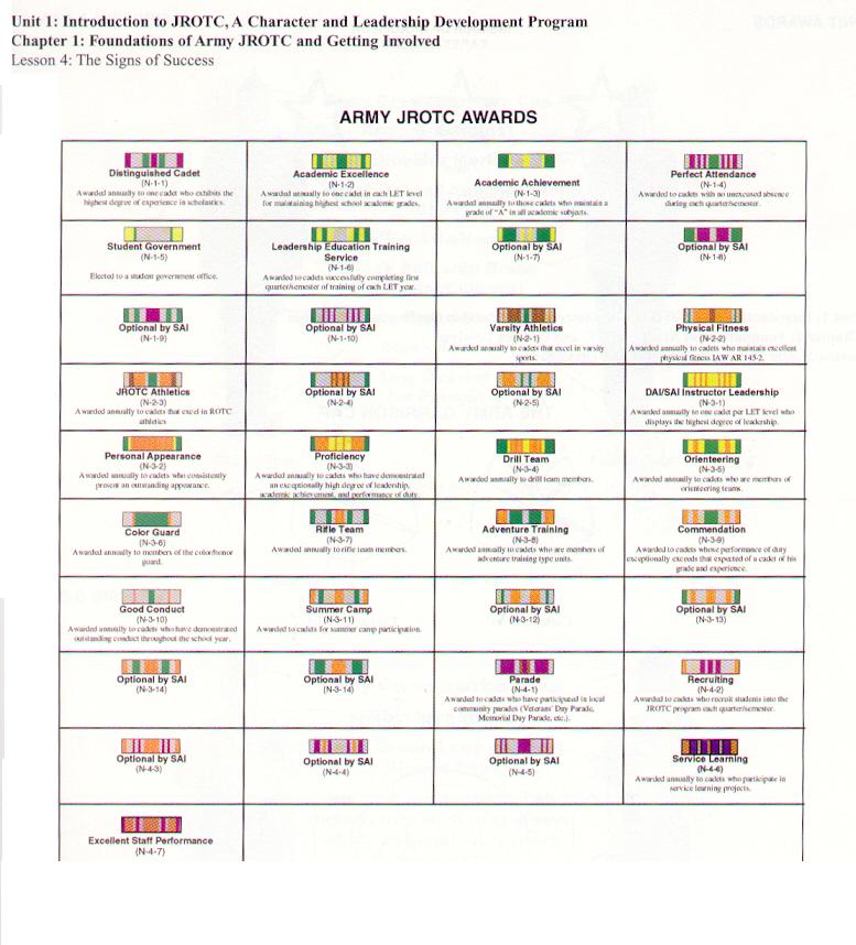 Here are the AJROTC ribbons that are awarded to cadets for specific events. They go on the left side of the uniform. Click to enlarge. |