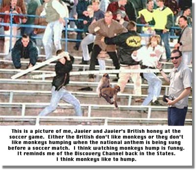 Javier and I decided to go to the ball game in London. Unfortunately, instead of playing baseball, everyone plays soccer here. I hate soccer. When I was five I got hit in the Mr. Winkie with a soccer ball. Soccer balls scare me. Anything dealing with kicking balls scares me. I hate soccer and ball kicking. Javier on the other hand likes soccer. He likes playing with balls. He's always rubbing his. If he wasn't a monkey I'm sure he would be a great soccer player. He certainly is a player.