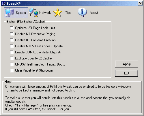 Speed-up Windows XP is a small tool to speed up Windows XP by optimizing file system, Cache and network settings. The program optimizes those hidden settings so that your system runs at its peak performance. SpeedXP also includes about 20 additional system, including MTU settings and Internet tweaks as well as a tips section.