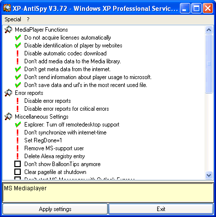 XP-AntiSpy is a small utility to quickly disable some built-in update and authentication features in WindowsXP that may rise security or privacy concerns in some people. For example, there is a service running in the background which is called Automatic Updates... that may sound useful to most people, but suspicious to others. You can disable all these features manually by going through your configuration, find the settings for each etc. However with XP-AntiSpy there is no need to do this, since it will show you all of them at once and let you choose which ones to disable. Not only will it save you a lot of time disabling them - it will also allow you to quickly re-enable them if you change your mind.