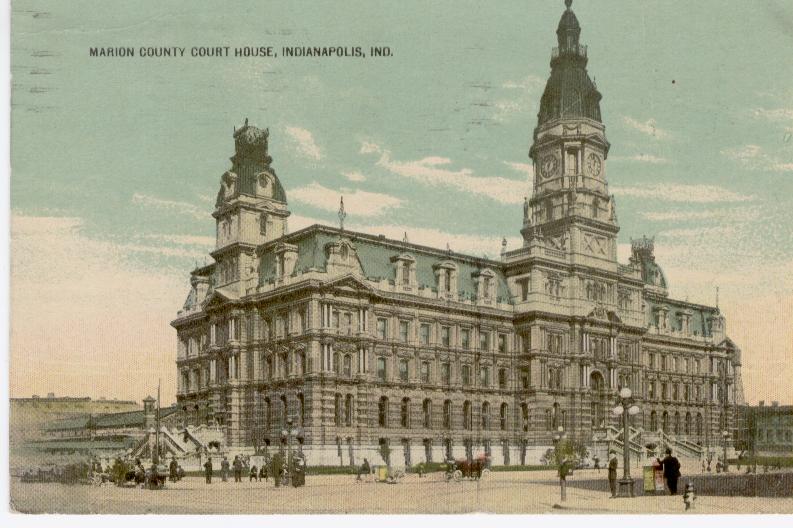 This 1914 postcard shows the old courthouse which was demolished in 1960 to make way for the City-County Building. County Number: 49 Seat: Indianapolis (April 1, 1822 - present) Built: 1960-62 Cost: $25.5 million Architect: Allied Architects & Engineers (Indianapolis) Builder: Huber, Hunt & Nichols, Inc. Style: Modern Population - Marion County (2002): 863,429 Population - Indianapolis (2002): 783,612 Size: 396.2 square miles Date of Organization: April 1, 1822 Named for: General Francis Marion Dates visited: 10/4/2003; 3/27/04 Courthouse address: 200 East Washington Street, Indianapolis, 46204 Go Back ||| Forward Home |