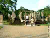 “Ata” in Atadage means eight. In this case this building would have been called by this name probably because of it housed eight relics including the main tooth relic or because it was completed in eight days. It is possible that this was built in eight days as there are indications that this building has used parts of other buildings in Anuradhapura era. The moonstone is a good example. This has been brought from Anuradhapura to be placed here. The "Velikkara" inscription stone on the left to this building is of significance. This is written in tamil language and explains that the protection of the tooth relic was done by a hired tamil army and not by the sinhalese. Today what remains here is the foundation and the stone pillars.