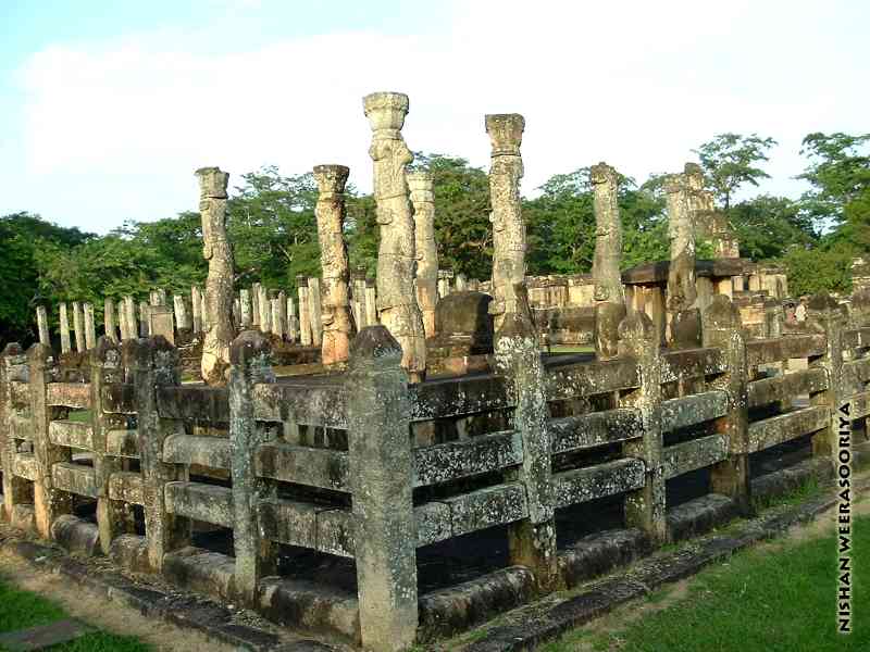 Nissanka Latha MandapayaThis building has been built by Nissanka Malla (1187-1196). The most important feature of this buiding is the shape and the carvings of the stone pillars. These pillars are carved in the shape of a lotus plant and are curved in three places. The top of the pillar take form of a lotus flower. On the centre is a small Stupa. The whole building is surrounded by a fence made out of stone. Photos