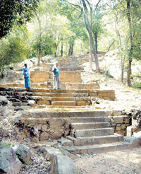 The road etched as it were on the edge of the mountain afforded a distant view of the plains below melting into misty greens. It was good driving. After the descent we seemed to be traveling on flat terrain. And now we were accompanied by a gushing canal of the Walawe waters, which ran closely parallel with the road. Here and there we met with old world edandas spanning the canal to give access to the properties on the opposite bank. It seemed as if the canal and the road were inseparable and we had quite got used to the idea too, when we lost sight of it momentarily, only to find it raised into a bridge like contraption making way for a branch road to travel under it. A peculiar sight.! And the canal joined the road again making a merry waterfall down some cemented steps back to its happy partnership with the road. These waters seemed to be the source of the people living here. We passed ideal bathing spots and shallow washing spots where the locals relaxed after attending to their daily chores, the surrounding trees giving excellent shade. Our destination was the Budugala ruins in Kalthota. After a while we stopped at an Archaeological Department sign board, and parking the vehicle on the side of the narrow road hardly enough for two vehicles to pass, we crossed the canal which by now had succumbed to a narrow deep drain. The site that met our eyes did seem interesting, but little information was available on it. Haphazard ruins seemed to litter the environs. Two large rectangular foundations of buildings could be seen connecting each other at the centre by a narrow bridge. Huge polished granite slabs comprised its construction. Quaint little stone stairways with simple balustrades led to them. A few stone columns bravely seemed to stand the test of time while a medley of others littered the area around. A steep granite stairway led uphill at first seemingly into the heavens. The steps sometimes accompanied by balustrades and embankments at different levels were built of stone in perfect geometrical harmony, with boulders littering the sides and the surrounding tree-scape creating an idyllic frame to a picturesque setting . We climbed further on the stone steps and suddenly came upon a clearing with yet another ruin of the same design but maybe of a slightly smaller proportion.. It is believed that the Budugala ruins are those of an ancient hermitage and the constructions found here have been dated to the 1st century BC. When we visited the ruins it was well into noon and the day was sweltering hot. But the forest of trees shaded the site. And the sun filtered through the trees freckled and dimpling at our feet. while the air rang with sweet bird calls. To my mind came a little poem I had read earlier .