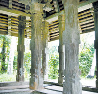 But it didn't take long for us to discover its wealth of wooden wonder. As we carefully entered its inside the carvings seemed to overwhelm us, covering almost every available space - unique concepts and combinations of art themes as varied as its numbers. The pillars that held the humble roof of this abode were abundantly decorated. The nine inner pillars some 6' in height were so profusely carved that I almost held my breath. Exquisitely carved rectangular squares half way on the pillars showed off mythical creatures, floral designs and scenes from every day life including wrestlers, musicians, dancers, acrobats, persons greeting each other, persons chatting etc. The corner pillars had grandiose capitals - almost out of place in this humble ambalama. The nineteen pillars that formed the outer posts were less elaborately carved. But displayed an elegance beyond compare. The woodwork of the roof consisted of beams, posts, rafters and reepers of exceptional wooden ornamentation. There were processions of animals, mythical creatures, peraheras with musicians, snakes in twisted combat, demigods. Fancy flowery and leafy designs filling in and giving the finishing touches The structure of the ambalama itself stood on platform 12' 4" and 9' 6" and raised about a foot from the ground with rubble, its log base resting on four rounded boulders. The Panapitiya ambalama has been dated to the 18th century. The Department of Archeology has renovated and restored it. It is believed that the ambalama may have stood as a rest hall enroute to an ancient foot path leading from Dambadeniya to Kurunegala and Yapahuwa. Today it stands as a unique monument of our ancient transport system. - a witness to maybe a million passers-by. And we sat down to enjoy a meal of imbul-kiribath sharing with its sole occupant a brown dog with sad eyes. by Kishanie S. Fernando Updated