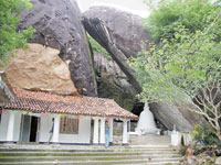 It is believed that the Pilikuththuwa cave complex includes some 99 caves spread over an area of about 200 acres. The caves are equipped with distinct drip ledges to prevent rain water from falling into the interior which, to some extent, is proof of their one time habitation. 77 of these have been identified and the numbers given them are marked on each cave. The Pilikuththuwa Raja Maha Vihara itself is housed in some of these caves. The Vihara Lena , the Devala lena, the Chaiththiya lena, the Avasa geya and the Dana Salas are some of the buildings that are still using the caves. These caves are easy of access and are situated in and around the temple itself. But to see some of the other caves you have to climb and walk endless miles into the wilderness. And that is just what we did - with no regrets ! Sunil and Anura led us through a maze of caves, rocks and wilderness. Occasionally stopping to point out some rare tree, creeper or bush or relate a local legend associated with the area. At times we climbed uphill and at times we walked downhill, at times on rocky plains at others on dank earth; sometimes our path was shaded by a canopy of tropical growth and sometimes we stood and looked down over their sea of endless crowns. And I completely lost my bearings. From time to time we emerged on to a cliff or summit and the distant hills gave us some idea of our position but it would have been far more interesting if we had brought a compass. We walked, climbed, jumped, hung and crawled -- from rock to rock and from mountain to valley. At one point we could get from one giant rock to the next only by way clinging on to its sheer surface with the aid of a typical Tarzan creeper. At another point there was an option -- thank God! -- between swinging along on overhanging creepers and crawling through a bat infested cave. I chose the latter. Now, when I think of it, I can’t believe I did it. An interesting cave we came across was locally dubbed Thoppigala lena. The rock formation was such that it formed a large, airy and ideal habitation. But what was unique was the almost circular hole, that was found at one end of the roof at the height of approximately 7 ½ feet from the floor. The cave itself is said to be situated in a highly secure position overlooking a wide area. And this is basis for the local legend associating it with King Valagamba who is said to have used these precincts as a sanctuary when he was fleeing the Cholan marauders. It is of further interest to note that archaeological excavations carried out here in 1995 have revealed some coloured beads and pottery dating to early periods and coins belonging to the Polonnaruwa and Dambadeniya periods. Another cave with tough access revealed a rock pool . We climbed down the side of a huge boulder, beating back the thick scrub and even some thorny bushes. Apart from getting scratched, scraped and bitten all over by some insect, it was worth the while for the cave housed a rock pool with a smooth roof curving over and protecting it in a delightful manner. And yet another cave could be accessed only by climbing up to it along the creepers that hung downwards from its roof. This was attempted only by the men in out party. And thankfully it was not on the way to the next cave. So I could easily ignore it. In fact every cave we passed through had its own awesome positioning and rugged beauty. The rock formations that aided the creation of the caves were incredible works of Mother Nature. It was like walking through chamber after chamber of granite marvels. While the granite alone caused wonderment, the variety of the tropical tangle that sheathed every possible nook and corner added to it, creating a perfect wilderness picture of an environment formed over aeons. And this is what I love so much and what makes places like this unique to our little island. Yoda puswela, Gal mala and the Kalantha bokkaWhile Pilikuththuwa is famous for its caves, other natural wonders also abound. Amongst its caves, and not far from the Pilikuththuwa Raja Maha Vihara, is the much celebrated yoda puswela or creeper. This Pilikuththuwa puswela is spread through a huge area and is said to be second only to the one at Sinharaja. It is also believed to be at least 500 years old. We looked for its roots and found them with some difficulty. It was a rare sight -- from the deep crevices of sheer rock its thick root twisted and raised itself up, out of a great abyss towards the freedom of the wilderness. We climbed the surrounding rocks through dark and narrow crevices to get a better view. To take a good picture of this gnarled and knotted titan was almost impossible as its tangled branches twisted and crept in all directions in a mighty jumble. We emerged from its clutches and stood on the edge of a cliff with a whole lot of scenery below us. Also not far from the Pilikuththuwa Raja Maha Vihara is the Dig gala or the Dig Thalawa - a rocky plain, consisting of about 1 mile of rock mass with a height of about 750 feet above sea level. This is also called the Balun gala or the look out post. . From here is visible the spectacular Gal mala. (coral) Out of a dense carpet of tangled green it soared upwards in an extraordinary arrangement. The vertical drain like depressions making waves in a down ward pattern. It is indeed an unusual sight. On the far horizon Gampaha town can be seen. While closer up, and from another side, is seen the Valagamba Raja Maha Vihara and, from yet another side, the Maligathenna Vihara. In quite another direction, and again by walking along a rocky plain, we made our way to the Valagamba Raja Maha Viharaya. On route we were introduced to the Kalantha bokka. A sheer abyss between two rocks, which is not for the faint hearted. At one point the distant horizon revealed the city of Colombo or so I was told. But to me what was thrilling was the tropical scenery which spread like a green-gold carpet around the bottom of the rock. The paddy fields in t