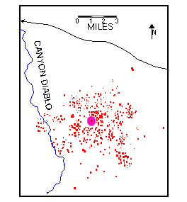Since the coming of man, hundreds, if not thousands of pieces of the meteor, ranging from a few grams to a couple hundred pounds, have been found and picked up from the so-called Canyon Diablo scatter field around the impact site. Up to this time no reliable estimate of the total overall weight found thus far, or for the estimated amount of remaining pieces, has been forthcomimg. Meteorite hunter Dr. Harvey Harlow Nininger, a well-respected student of things-meteor, has estimated that about 30 tons of specimens had been collected. Workers have estimated that 8,000 tons of iron are contained in the fine grained material around the crater. This leaves about 55,000 tons to speculate about. Some of it remains buried as drilling in the crater for the main bolide has shown. Some of it remains in the form of specimens in area surrounding the crater. Until the area was closed to meteorite hunting recently, hunters with metal detectors were still finding significant pieces. However, as stated above by Pierazzo, et al, 85 percent, 51,000 tons, the vast majority of the impacting body creating the crater, vaporized. It instantly turned from a solid nickel and iron rock into a gas, creating a cloud of super heated vapor riding the crest of the 2000 mile per hour winds, only to cool and condensed and rain nickel and iron spheroids down upon hundereds of square miles in every direction. True, probably not as grandiose as a single, huge thirty ton boulder from space buried or sitting there, but that's where the answer to the "What Happened to the Meteorite?" question stands now.
