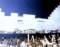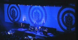 In live performance, Pink Floyd always provided amazing visual elements: like they were the very first group to use light effects. And at the later The Wall tour, they played under a great wall which keep building, while David was playing guitar 20 ft. far from Roger, just before the concert ends, the built great wall would be broken down and collapsed, as follow the music contents.