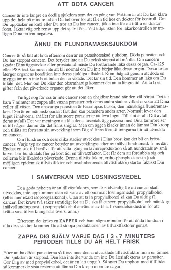 Zapper Att kunna döda dina bakterier och andra inkräktare med elektricitet blir mer likt ett universalmedel när Du kan göra alltsammans i tre 7 minuters sessioner. Det dödar både stora och små inkräktare: flundramaskar, spolmask, kvalster, virus och svamp. Det dödar dem genast inom 7 minuter. Hur fungerar detta? Jag antar att en positiv spänning applicerad var som helst på kroppen attraherar negativt laddade saker. Möjligen sliter batterispänningen i dem och drar ut dem från sina ställen i cellernas dörröppningar "conductance channels". Men dörröppningarna kan vara negativt laddade också. Sliter spänningen i dem så att de spyr ut några bakterier fästade i dem? Hur kan en positiv spänning åstadkomma att en så stor parasit som flundramask dödas? Ingen av dessa frågor kan ännu besvaras. Den viktigaste frågan är naturligtvis om det finns någon skadlig effekt på dig. Jag har inte sett några effekter på blodtrycket eller kroppstemperaturen. Det har aldrig skapats någon smärta, däremot har har befintlig smärta omedelbart upphört. Detta bevisar ändå inte att det är säkert. Även fast man vet att spänningen kommer från ett 9 volts batteri bevisar inte detta säkerheten fast det känns lugnande. Ihopklumpandet av röda blodcellsplättar och funktioner som beror å ytspänningen hos celler behöver utredas. Innan dess ligger din säkerhet exponerad i en kort period som är nödvändig. Virus och bakterier försvinner inom 3 minuter, band och binnikemask stadier, flundramaskar och spolmaskar inom 5 minuter och kvalster inom 7 minuter. Man behöver inte hålla på längre tid, fast det har aldrig setts några dåliga effekter av längre behandling. De första 7 minuterna med zappning följs av en paus i 20 minuter. Under denna tid frigöres virus och bakterier från de döende parasiterna och startar med att inkräkta dig istället. De andra 7 minuterna kommer att döda dessa nyligen frigjorda virus och bakterier. OBS !! Om du hoppar över dessa andra 7 minuter så kan du genast få ont i halsen eller få en förkylning eller något annat. Nu frigöres igen virus från döende bakterier. Den tredje perioden dödar de sista frigjorda virusen. Zappa inte om du är gravid eller bär pacemaker. Dessa situationer har ännu inte undersökts. Experimentera inte själv. Unga barn (8 månader) har zappats utan noterbara dåliga effekter. För deras skull bör du väga för och nackdelarna mot de okända riskerna. Zappning strömmen når inte in i ögongloberna eller in i testiklarna, ej heller in i tarminnehållet. Den når inte in i gallstenar eller in i dina celler (ryggmärgen) där Herpes virus ligger latent eller där Candida svampar utbreder sig. Men genom att zappa 3 gånger i veckan eller mer så kan du utplåna dessa populationer också ofta helt. När ett stort antal parasiter, virus och bakterier dödas så kan det kännas tröttande. Försök att ta en låg stressad dag efter första zappningen. Att använda zappern. 1. Linda stavarna med vått hushållspapper och håll lagom hårt (äldre modeller), på dom nyare sätter man bara band runt handlederna. Slå på zappern. 2. Zappa i 7 minuter, slå av zappern och vila i 20 minuter. Zappa sedan 7 minuter igen, vila 20 minuter och slutligen zappa 7 minuter till.