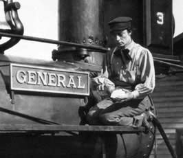 In his movie of the story, Keaton plays Johnnie Gray, a Georgia train engineer who, when the Civil War reaches his home town of Marietta, is as willing to enlist as anyone. Unfortunately, the recruiter refuses to enlist Johnnie because he is of more use to the South as an engineer than as a soldier. Even more unfortunately, the recruiter doesn't tell Johnnie why he was turned down, leading Johnnie's girlfriend Annabelle (Marion Mack) and her family to believe that Johnnie is a coward. Annabelle tells Johnnie she never wants to speak to him again "until you're wearing a uniform." But when Johnnie's train is hijacked by the Northerners, his heroism eventually gets the train back, defeats the Northern soldiers, and rescues Annabelle after the Northerners kidnap her. (Ironically, Annabelle gets her wish; when Johnnie rescues her, he is wearing a Northern soldier's uniform, which he had to don in order to get behind enemy lines.)