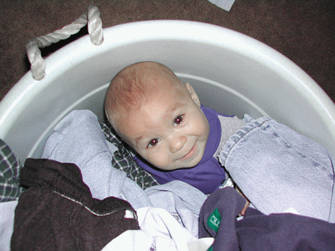Well, throwing the baby out with the bath water is one thing, but sticking him in laundry? Peuww. Actually, he loves the "climb in the clean clothes game" and it looks like his dad got a great shot.