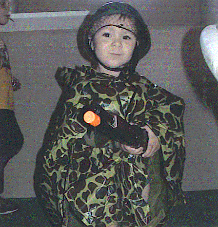 Ten-hut. More like two-hut, really, and barely that. Adrian's dad was a marine (retired not deceased) and I think that's where he got the idea. Sweet little soldier, huh?
