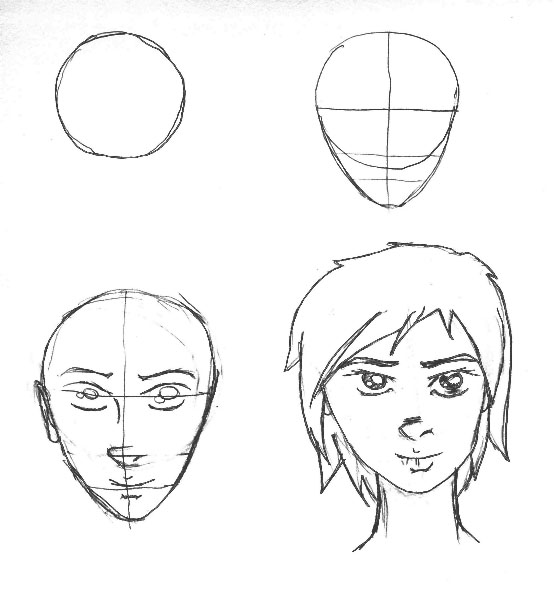 The head starts out as a rough circle. Then add the general shape of the