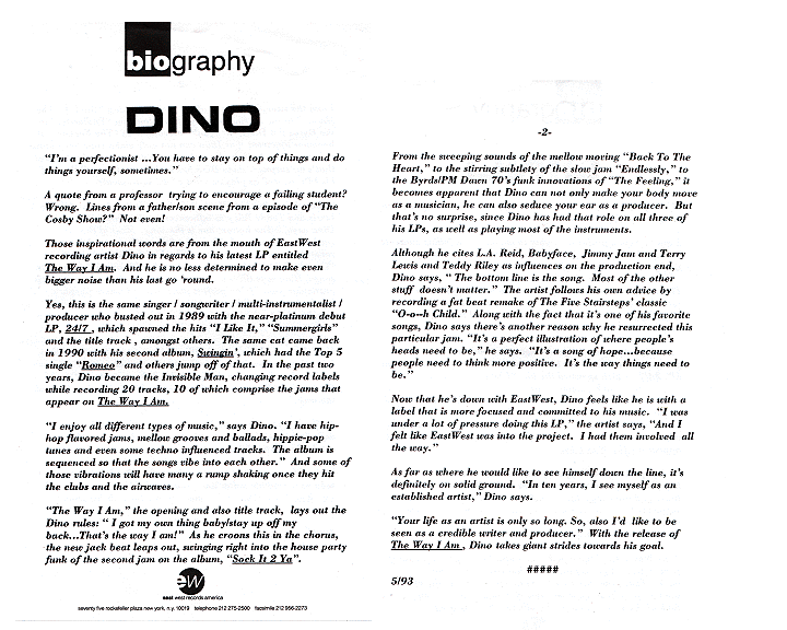 Yes, this is the same singer/songwriter/multi-instrumentalist/producer who busted out in 1989 with the near-platinum debut LP, 24/7, which spawned the hits ''I Like It,'' Summergirls,'' and the title track, amongst others. The same cat came back in 1990 with his second album, SWINGIN', which had the Top 5 single ''Romeo'' and others jump off of that. In the past two years, Dino became the Invisble Man, changing record labels while recording 20 tracks, 10 of which comprise the jams that appear on THE WAY I AM.