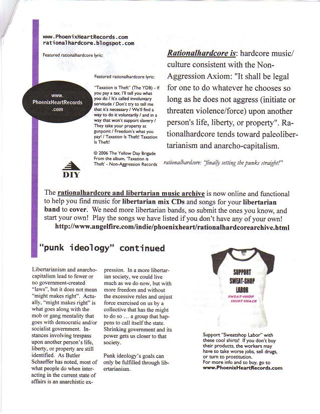 A): Three guys in a punk/hardcore band. Bassist dropped out of school and left. Drummer got his drums stuck on the highway in the middle of nowhere when his car broke down. I played guitar, and offered to the drummer the opportunity to play second guitar or bass with a drum machine, and he declined. I worked on my own, then enlisted another guy to play second guitar. He just wanted to do jazz, so we cut a jazz song and then he left. Hey, this is individualist music, and I don’t need anyone else to do it. I like taking the “screamer-songwriter” approach! Disgusted with the scene(s) and (especially leftist) politics in general, I had something relevant to say. I missed oldschool hardcore/punk, and anymore the people making “punk” or “hardcore” or whatever music don’t get it. Most people, even those who were a part of it, never really got it. That makes it my job to analyze and criticize it all. The college influence is horrible. The popularity of “punk” combines with a yearly crop of brainwashed morons, which go out and influence everyone younger and older. As for punk/hardcore music, clear thinking is absent, while emotional overload (and some green in the pocket) seems to be the goal of today’s writers. Rationalhardcore is the answer to all of that. Stop kidding yourself. Taxation is theft. I am writing libertarian industrialized oldschool hardcore anthems for a rationalhardcore revolution. I mean to lead by example.