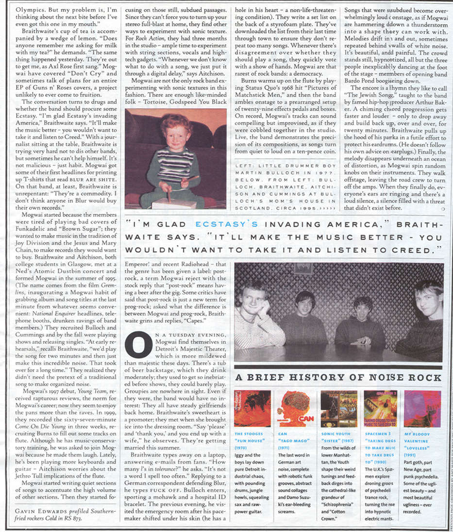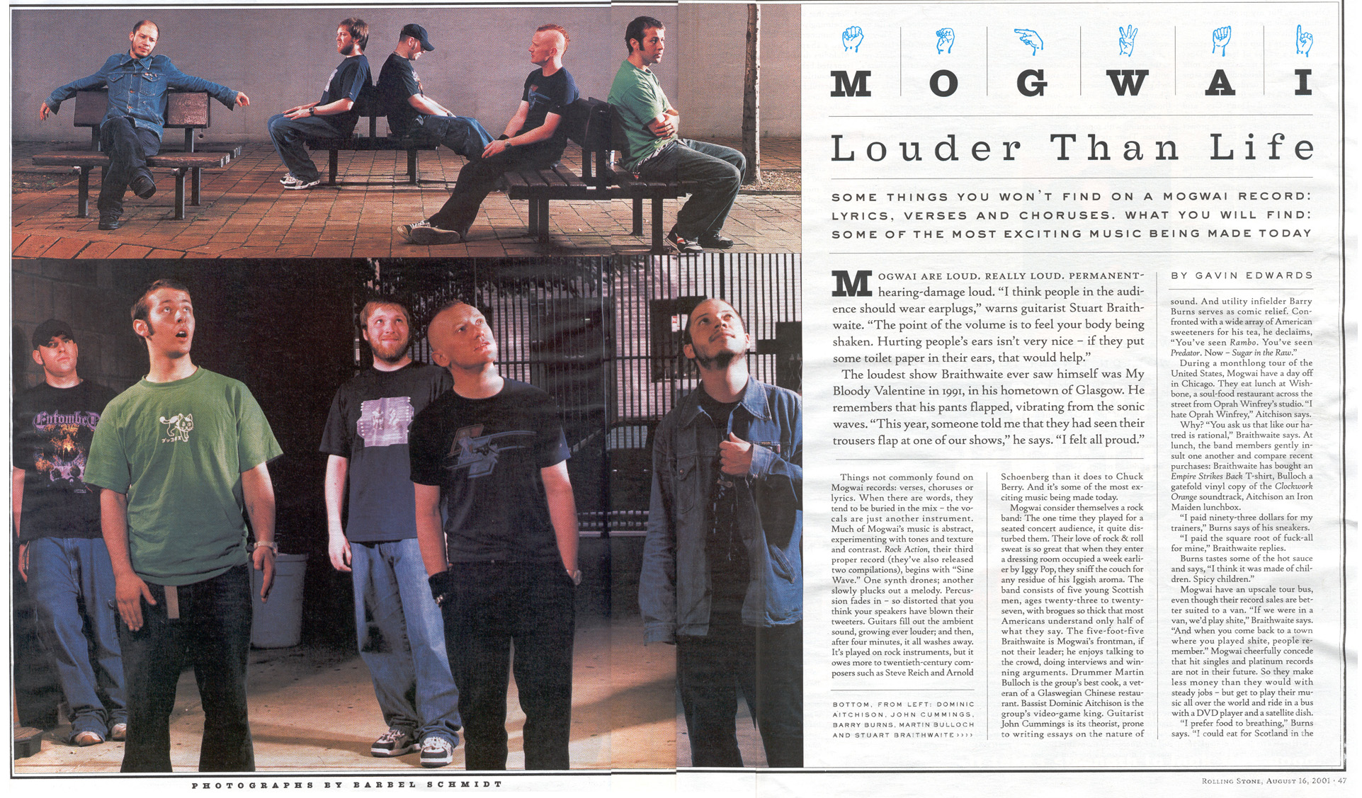 Mogwai consider themselves a rock band: The one time they played for a seated concert audience, it quite disturbed them. Their love of rock & roll sweat is so great that when they enter a dressing room occupied a week earlier by Iggy Pop, they sniff the couch for any residue of his Iggish aroma. The band consists of five young Scottish men, ages twenty-three to twenty-seven, with brogues so thick that most Americans understand only half of what they say. The five-foot-five Braithwaite is Mogwai's frontman, if not their leader; he enjoys talking to the crowd, doing interviews and winning arguments. Drummer Martin Bulloch is the group's best cook, a veteran of a Glaswegian Chinese restaurant. Bassist Dominic Aitchison is the group's video-game king. Guitarist John Cummings is its theorist, prone to writing essays on the nature of sound. And utility infielder Barry Burns serves as comic relief. Confronted with a wide array of American sweeteners for his tea, he declaims, "You've seen Rambo. You've seen Predator. Now - Sugar in the Raw."