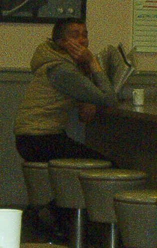 this man lives at express donuts. he sits there by himself, looking quite depressed. he also has a mullet but it's tucked into his hood.