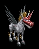 Pegasus with a red metal mask. A horizontal slit is it's eyes. It has a yellow mane and a horn like