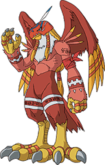 5. Garudamon - A giant woman-like digimon with red armor and a red partridge face. Long wisps of red with golden yellow writings flow from her head. She can fly and looks very much like an eagle. She digivolves from Birdramon. Her attack is a flaming bird missile called "Wing Blade".