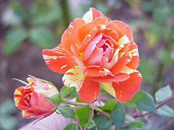 Tani's Roses: (left to right) Little White Lies, a miniature rose for hanging baskets; Looks Like Fun, a variegated variety of rose; and Pandemonium, another variegated variety. These are the sources for all three names of the siblings in one of Tani's litters.