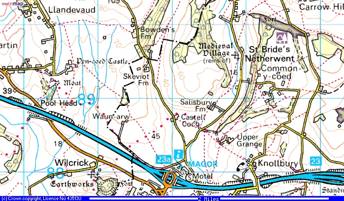 This picture is a road map which shows Junction 23 on the M4 Motorway. The western side of the motorway comes from Newport and Cardiff, and the eastern side comes from Bristol, London, and Bath. In the upper-left quadrant of the map you will see the words "Pen-Coed Castle", which indicates the castle's location (obviously enough). On the edge of the map, you will see part of the title for the town of Llanmartin (Meaning "Church of St. Martin" from Welsh). This is the location of Llanmartin Church mentioned on the main page, and is also the means by which you should have access to the castle. By using the roads from Llanmartin or Llandevaud, you should have no trouble getting there.