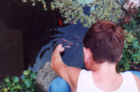 My travel buddy, Chick Magnet, teasing the fish in G's pond.