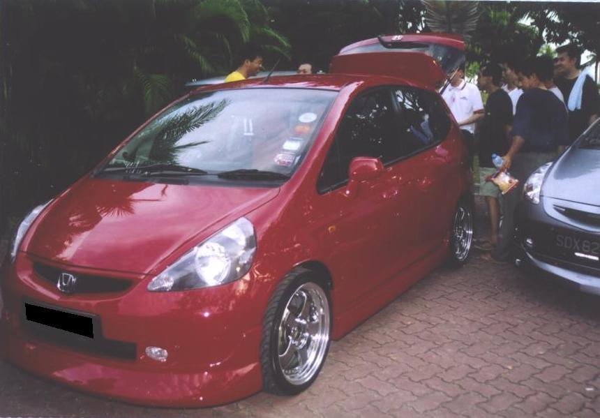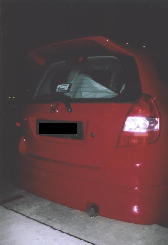 The back of the Jazz with a bus-stop spoiler, chrome no. plate and sticked on muffler.