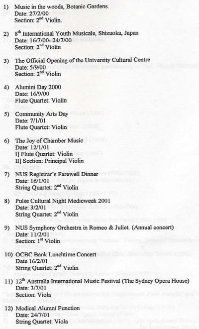 I would like to take this opportunity to thank my music teachers and friends. To name a few Mr Luo Chen, Mr Lim Soon Lee, Ms Marietta Ku, Ms Shao Suan, Mrs Goh, Ms Judy Tay, Mr Ho Boon Thiam, Mr Timothy Ku, Sylvia, Karen, Odesa, Peiyun, Lim Wee Beng, Jit Min, Sharon Ham, Jason, Joanna, Meng Shyan, Rok Ting, Hwey Ping, Min Xi, Edmund, May Lau, Rudy Sabarudin, Teck Koon, Ma Xiang, Ling Lu, Wah Yong. :) I would also like to thank Ms Sylvia McCully for her dedication in teaching the art of dancing to all her students.