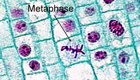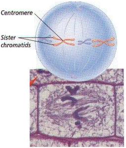 Metaphase begins when the chromatid pairs line up along the center of the cell. They do this so that they can be in a position to migrate to opposite ends of the cell in anaphase. The line they form is called the equatorial, or metaphasic, plate. Metaphase ends when the centromeres divide, causing the chromatids to separate back into their original chromosomes. The next step in the cell cycle, the third stage of mitosis, is anaphase.