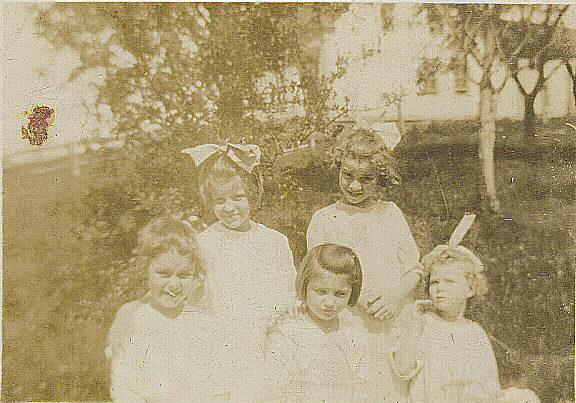 From left back to right: Gladys Landels, Dorothy Landels, Muriel Landels, Doris Hamilton and Florence Hamilton. Taken about 1923 in River Hibert.