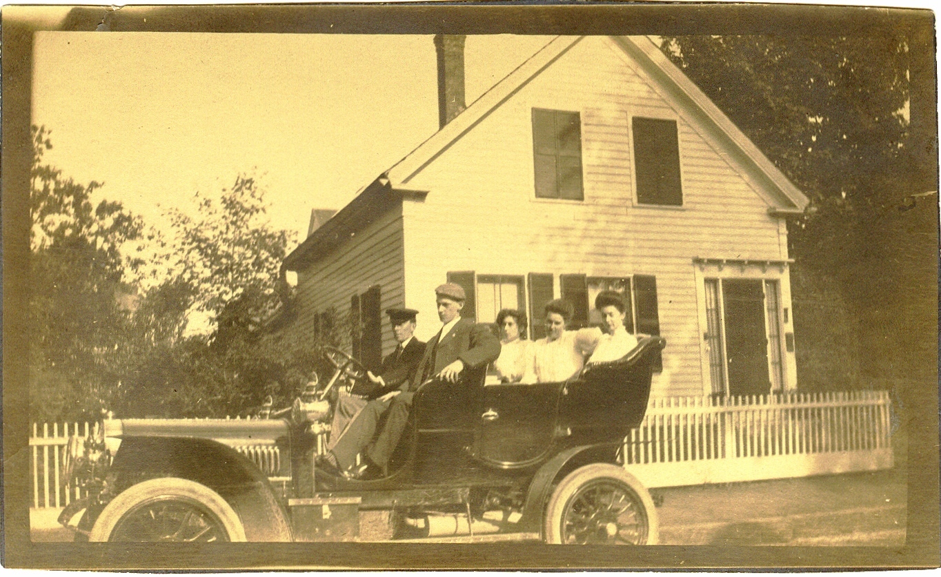 Henry J. Murch driving, Benjamin E. Murch Jr. passenger, Millicent Murch in the back middle and two unknowns.