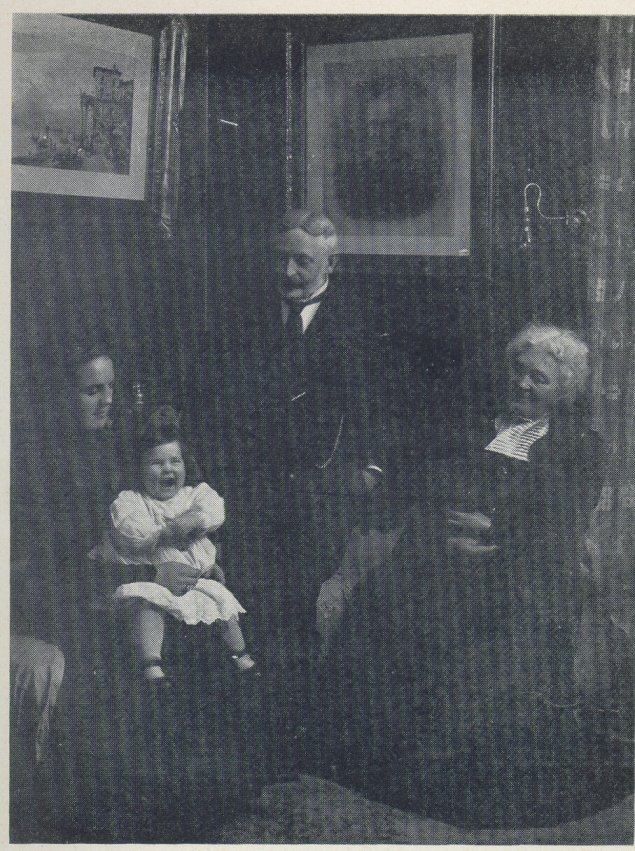 The portrait on the wall is of John Dennis, on the right sitting is Mary Ann (Parnall) Dennis, standing is William Dennis, on the left sitting is Agnes (Miller) Dennis with one of their daughters.