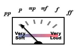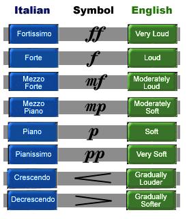 Here are the symbols and names used to refer to various dynamic levels. Notice that the words are in Italian. This is because the first composers to include instructions about dynamics were Italian.