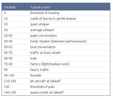Volume, the actual amount of sound energy produced, is measured in decibels (dB) and can range from barely audible sounds to very loud, potentially damaging sounds. The way the table is organized, each 10dB increase represents an increase of 10 times the volume! So, rustling leaves are about 10 times quieter than the average whisper.