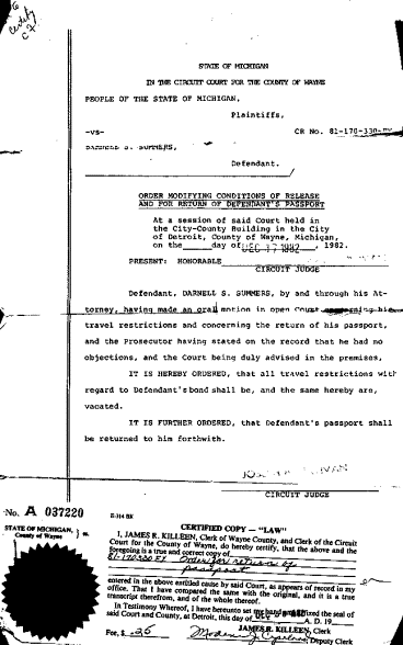 The Government was so desperate after their main witness, Gale Simmons, recanted her testimony (which was scripted and which she only gave under threats of continued imprisonment) that they allowed me to leave the country although I was still under indictment for 1st Degree Murder. No one, to my knowledge and certainly no Black man, has ever been allowed to leave the jail, the neighborhood, or the city let alone the country, after being charged with the murder of a white policeman and with a trial pending. I have been extradited-kidnapped from two different continents on these bogus charges. In 1968 I was brought back to the US from Viet Nam to ultimately face the Murder charges and of course in 1982 from Germany. After the court order below was issued I was free to come and go as I pleased. Just a scant 4 months prior to this Court Order I had been extradited from Germany after serving 5 months in extradition arrest, with bond denied because the German Government felt that I might flee prosecution. If anything can point to the bankrupt nature of their charges against me then this train of events should suffice. The conduct and criminality of the Prosecution and the Courts, in my case, is unparalelled and without precedent in the annals of US Jurisprudence. With a great deal of Hoopla it was proclaimed that the government had Ògotten their manÓ and that this case, after so many years, finally would go to trial. How wrong they were.