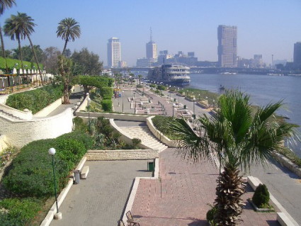 Banks of the Nile. There are nice 'park' areas like this all over the city. Notice how many people are in this place? None, even though it's the middle of a lovely day. The reason for this is that you have to pay to get into these types of places. The bridge upon which we took this photo was heaving with bodies.