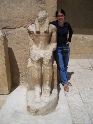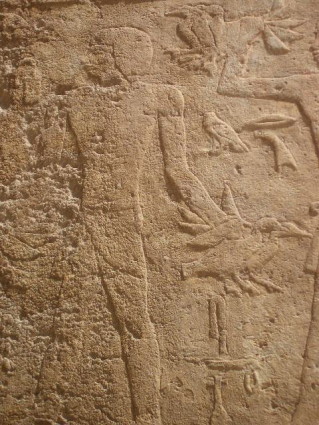 Heather and I almost didn't go near the doorway above, as we thought it had been built recently. It looks so new. We then passed as sign explaining that it was original with the pyramids. We couldn't believe it. Below is a picture of a hunter that was carved on the wall behind that statue on the right.