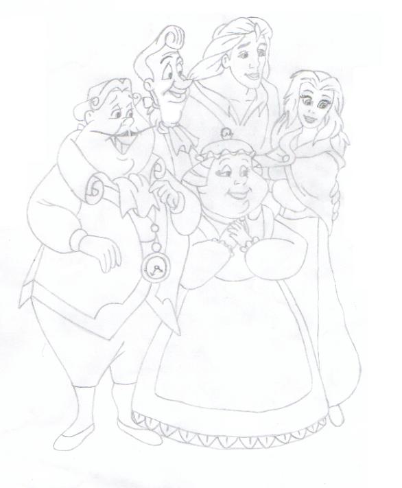 Cogsworth, Lumiere, Mrs. Potts and the Beast, as humans, along with Belle.