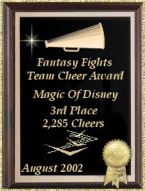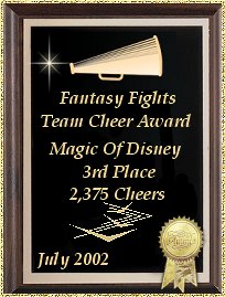 Some holiday gifts I've received from Fantasy Fights -- Thanksgiving 2001, Christmas 2001, Valentine's Day 2002, St. Patrick's Day 2002, Easter 2002, Mother's Day 2002, 4th of July 2002 and Friendship Day 2002. Thanks to Rebjess and Sprite Tink for all these gifts.A once off gift from my wonderful Team Leader, Rebjess, for my cheering efforts! Thankyou, Rebjess -- I love it!