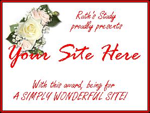The criteria are easy...your site must be kid and family safe (no pornography or anything else that would offend your dear old grandma), it must be dedicated to the subject of the award that you're applying for, it should be easy to navigate, pleasing to the eye, and I have to like it! (that last one's not hard...I like just about every site I see!). That said, if your site meets these criteria, just fill in the little form below and nominate yourself or another site for an award! Obviously the real award graphic has the name of your site written on it in the middle. So...go fill in my form!