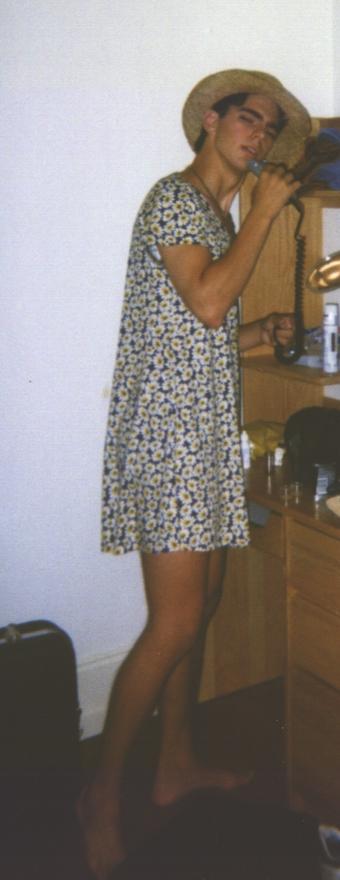 Wear a Dress Wednesday --Nave wearing my sundress, showing off his sexy legs