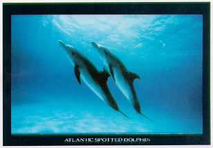 The Atlantic Spotted Dolphin is a small, long snouted, and spotted. Their color is purplish gray, but from a distance they look black with white spots. On their sides is a lighter gray and on their stomach is mostly white. They have a chunky beak with a spot of white on the end. The name of the Atlantic Spotted Dolphin comes from the spots that the dolphin develops as they age. The older the dolphin the more spots it will have. The females tend to be larger than the males. They are about six feet long and weigh approximately 200 pounds when they reach adulthood. These dolphins eat squid and a wide variety of fish. Atlantic Spotted Dolphins live in groups. These groups sometimes reach as many as fifty dolphins in it. However, the normal is between 5 and 15 to a group. These dolphins are very active and vocal. They do high jumps and forward flips much of the time. They also help other members of their school if they are in distress. Sharks prey on Atlantic Spotted Dolphins. The mother carries a baby dolphin in her womb from 11 to 12 months. They use sonar to aid in navigation and hunting.