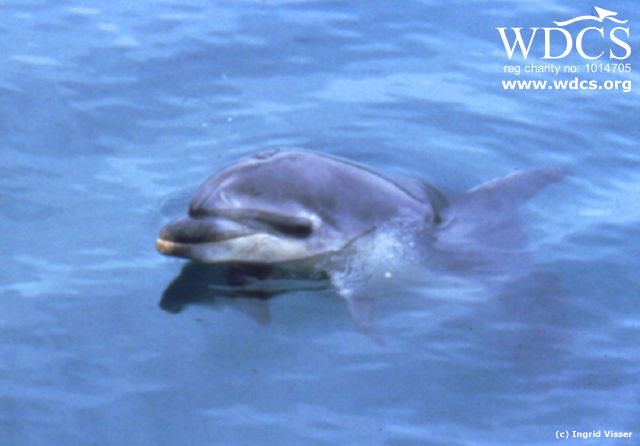 The Bottlenose Dolphin was made famous by Flipper. The Bottlenose Dolphin is a large animal with a slightly hooked broad dorsal fin. The dorsal cape ranges from dark blue to brown-grey, fading to a pale grey along the flanks. The ventral surface is white-pink, and the tip of the snout is normally white. Tail flukes and the flippers' edges are grey-black. Dark lines from melon to eye and eye to flipper can also be seen. Bottlenose Dolphins eat a variety of fish, squid, and octopi. They stay in groups that range from 10 to several hundred. They like to jump alongside moving vessels. These dolphins live for about 30 years.