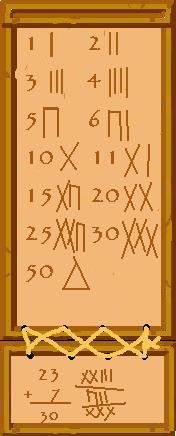 | As you can see we don't have as many letters as you do. Only 21. They are the basis not only for our writing but for our math, our monetary units and our wieghts and measures. To the right is how the alphabet was implied to our numerical digits and under it how a math equation is written down. It may look funny to you. But your way is even more complex and odd. But to each his own. Now that you have the generals down to all this, lets move on to bigger things. Language, Music and Art. Oh just a quick word about the writing tablets used. They are wood frames of wax that are hinged together with string. The tool on the board to the left to write with is a "Stylus". It has a sharp edge to write with and a flat end to erase with. Paper and ink shipped from Egypt is far to expensive to waste on childrens mistakes. It is reserved poets and playwrites. Well it is time for classes to begin. Click on the scrolls down below to choose a class. |