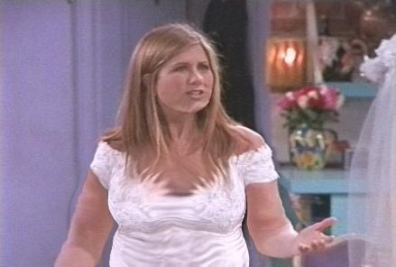 As Jennifer Aniston's weight has increased producers continue to stramble for ideas. This picture is from an episode were Rachel is about to be married to her chef boyfriend. Monica has made Rachel worried that her soon-to-be hubbie is going to make her to fat to move as he will be cooking all the meals and wanting her to sample his creations. It is unknown if Rachel goes through with the wedding though as I was tackled by a security guard, dragged to a car, put in its trunk, and sent on a wild ride.