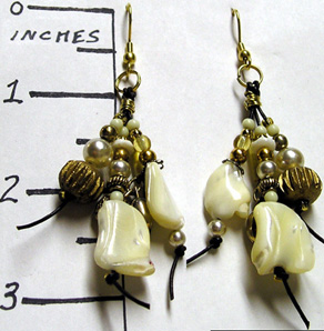 My Original Dangle EarringsWelcome! Here you will find my original-design earrings. If you are interested in purchasing any of them, contact me at mysticmom4@hotmail.com as soon as you can. Several are one of a kind. I use leather cord and rescued baubles and beads, gold-plated or sterling silver ear wires according to the design color theme. To see more selections see my other photo album https://www.angelfire.com/journal/carols24poems/original_earrings/ or just e-mail me and I will work with you to create a custom pair. If you wish for a sterling silver ear wire, please state that in your order. EACH PAIR cost $20 in the U.S. and $24 in Canada or Europe. Money Order in U.S. Dollars only. Cost includes shipping. Thank you!! Enjoy.